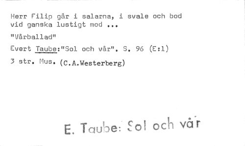 //// Herr Filip går i salarna, i svale och bod vid ganska lustigt mod //// "Vårballad" //// Evert Taube:"Sol och vår". S. 96 (E:1) 3 str. Nus. (C.A.Westerberg) //// E. Taube.Sol och va //// r ////