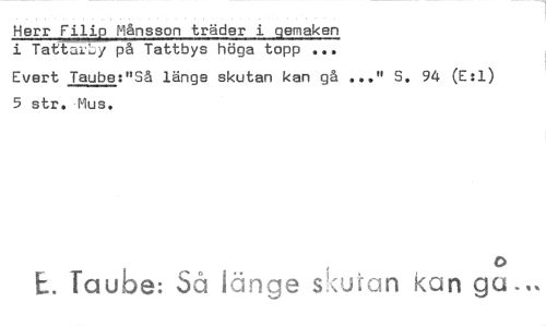 //// Herr Filip Månsson träder i gemaken i Tattany på Tattbys höga topp //// Evert Taube:"Så länge skutan kan gå ,.." S. 94 (E:1) 5 str.-Mus. //// 0 //// E. Taube: Så länge swian kan g ////