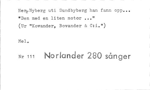 //// Herr Nyberg uti Sundbyberg han fann opp... "Den med en liten motor ..." //// (Ur "Kovander, Bovander & C:i.") //// Mels. //// Nr 111 Norlander 280 sånger ////