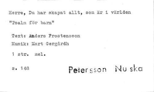//// Herre, Du har skapat allt, som är i världen "Psalm för barn" //// Text: Atders Prostensson Musik: Mart Gergårdh //// 1 str° mel. //// s. 148 Peter ,T,son Nu ska ////
