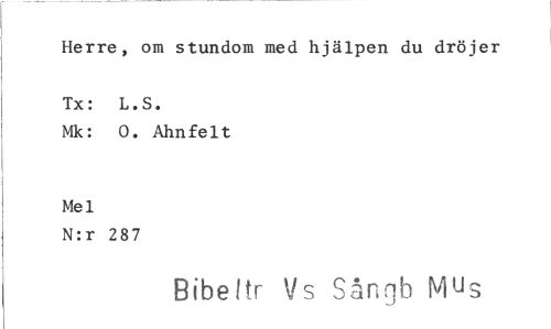 //// Herre, om stundom med hjälpen du dröjer //// Tx: L.S. //// Mk: 0. Ahnfelt //// Me l //// N:r 287 //// Bibeltr Vs Sångb Mus ////