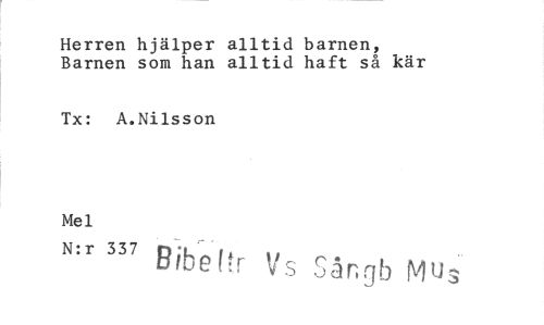 //// Herren hjälper alltid barnen, Barnen som han alltid haft så kär //// Tx: A.Nilsson //// Mel //// N:r 337 Bibe fr Vs Sångb Mus ////