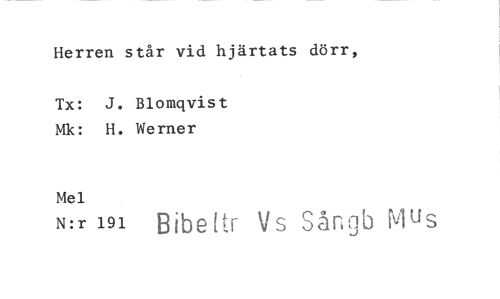 //// Herren står vid hjärtats dörr, //// Tx: J. Blomqvist Mk: H. Werner //// Mel //// N:r 191 Bibettr Vs Sångb Mus ////