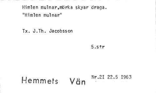 //// Himlen mulnar,mörka skyar draga. "Himlen mulnar" //// Tx. J.Th. Jacobsson //// 5.str //// Nr.2I 22.5 1963 //// Hemmets Vän ////