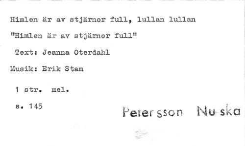 //// Himlen är av stjärnor full, lullan lullan "Himlen är av stjärnor full" //// Text: Jeanna Oterdahl //// Musik: Erik Stam //// 1 str. mel. //// s. 145 '*e er sen u s. a ////
