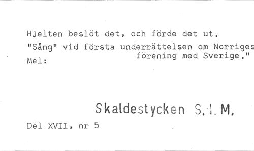 //// Hjelten beslöt det, och förde det ut. //// "Sång" vid första underrättelsen om NorrigeE Mel: förening med Sverige." //// Skaldestycken S, M. //// Del XVII, nr 5 ////