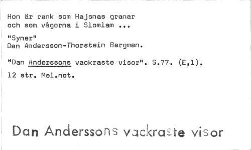 //// Hon är rank som Hajsnas granar och som vågorna i Slomlam //// "Syner" //// Dan Andersson-Thorstein Bergman. //// "Dan Anderssons vackraste visor". S.77. (E,1). 12 str. Mel.not. //// Dan Anderssons v.uckra te visor ////