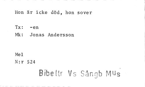 //// Hon är icke död, hon sover //// Tx: -en //// Mk: Jonas Andersson //// Mel //// N:r 524 //// 13ibeltr Vs Sångb Mus ////