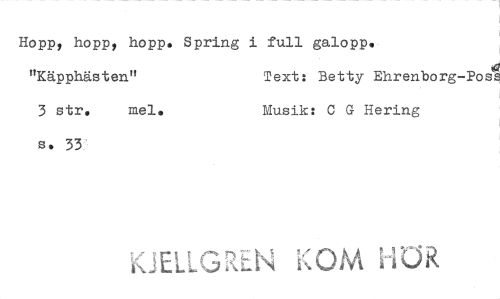 //// Hopp, hopp, hopp. Spring i full galopp. //// "Käpphästen" 4 //// Text: Betty Ehrenborg-Posg //// 3 str. inel. Musik: C G Hering //// s. 33 //// KJELIGnN KOM HÖR ////