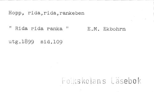 //// Hopp, rida,rida,rankeben //// " Rida rida ranka " E.M. Ekbohrn //// utg.1899 sid.109 //// is Läsebo ////