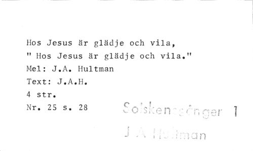 //// Hos Jesus är glädje och vila, //// " Hos Jesus är glädje och vila." Mel: J.A. Hultman //// Text: J.A.H. //// 4 str. //// Nr. 25 S. 28 & ////