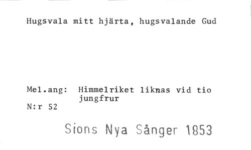 //// Hugsvala mitt hjärta, hugsvalande Gud //// Mel.ang: Himmelriket liknas vid tio jungfrur //// N:r 52 //// Sions Nya Sånger 1853 ////