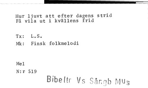 //// Hur ljuvt att efter dagens strid Få vila ut i kvällens frid //// Tx: L.S. //// Mk: Finsk folkmelodi //// Mel //// N:r 519 //// Bibeltr Vs Sånrib Mu; ////