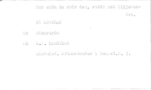 //// Hur skön du står der, stödd mot liljellan- //// den. //// På afstånd //// x Bäckström //// Lk A.J. Lindblad //// Lindblad, Anonstunder i heLmet.H. 3. ////