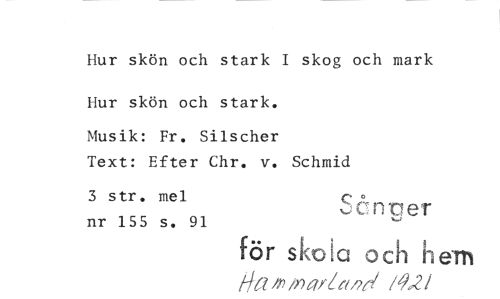 //// Hur skön och stark I skog och mark Hur skön och stark. //// Musik: Fr. Silscher //// Text: Efter Chr. v. Schmid //// 3 str. mel nr 155 s. 91 c0, //// r-reer //// för sko a och hem //// Ha iii /),) af/ any-i 02 //// /