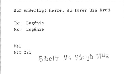 //// Hur underligt Herre, du förer din brud //// Tx: Eugdnie //// Mk: Eug6nie //// Mel //// N:r 281 Bibeltr Vs Aub Mus ////
