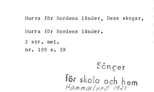 //// Hurra för Nordens länder, Dess skogar, Hurra för Nordens länder. //// 2 str. mel. nr. 109 s. 59 //// er //// för skota och hem //// kiaiyuy)arå(pc( m2 //// /