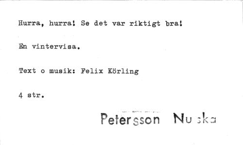 //// Hurra, hurra: Se det var riktigt bra: En vintervise. //// Text o musik: Felix Körling //// 4 str. //// Peter son N uk vi ////