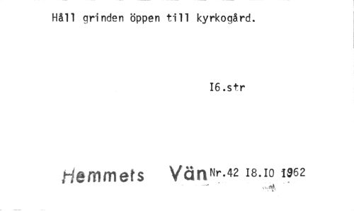 //// Håll grinden öppen till kyrkogård. //// I6.str //// Hemmets VänNr.42 18.10 1962 ////