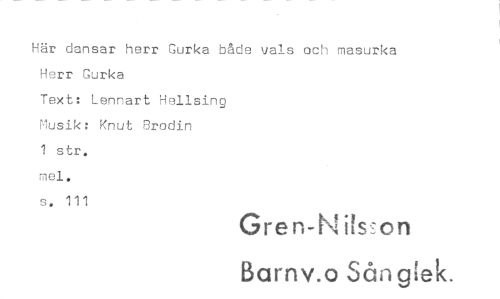 //// Här dansar herr Gurka både vals och masurka //// Herr Gurka //// Text: Lennart Hellsing //// Musik: Knut Brodin //// 1 str. mel. //// s. 111 //// Gren-N ilson //// Barnv.o Sån g[e ////