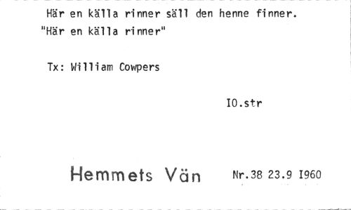 //// Här en källa rinner säll den henne finner. "Här en källa rinner" //// Tx: William Cowpers //// IO.str //// Hemmets Vän Nr.38 23.9 1960 ////