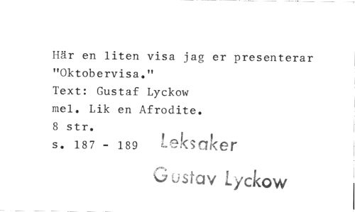 //// Här en liten visa jag er presenterar "Oktobervisa." //// Text: Gustaf Lyckow //// mel. Lik en Afrodite. //// 8 str. //// s. 187 - 189 Le=kbcker //// Gustav Lyckow ////