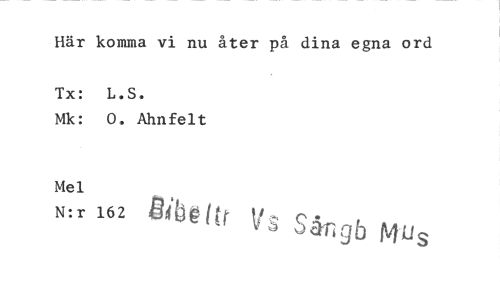 //// Här komma vi nu åter på dina egna ord //// Tx: L.S. //// Mk: 0. Ahnfelt //// Mel //// N:r 162 (ht@ itt v3 Sårs, p4 ////