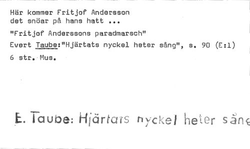 //// Här kommer Fritjof Andersson det snöar på hans hatt //// "Fritjof Anderssons paradmarsch" //// Evert Taube:"Hjärtats nyckel heter sång", s. 90 (E:1) 6 str.-Mus. //// L. Taube: Hjärtats nyckel heter sn ////