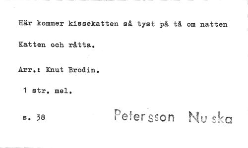 //// Här kommer kissekatten så tyst på tå om natten Katten och råtta. //// Arr.: Knut Brodin. 1 str. mel. //// s. 38 ////