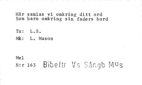 //// Här samlas vi omkring ditt ord Som barn omkring sin faders bord //// Tx: L.S. //// Mk: L. Mason //// Mel //// N:r 163 Bibeltr Vs Sångb Mus ////