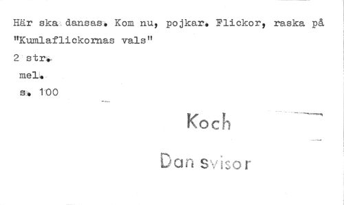//// Här ska dansas. Kom nu y pojkar. Flickor, raska på "Kumlaflickornas vals" //// 2 str. //// ss 100 //// Kock //// .1)an svisor ////