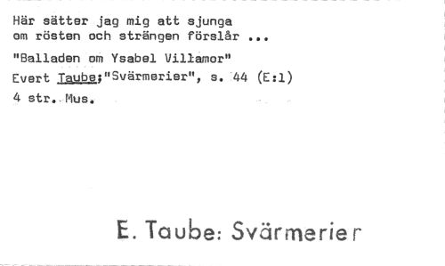 //// Här sätter jag mig att sjunga om rösten och strängen förslår //// "Balladen om Ysabel Villamor" //// Evert TaubeVSvärmerier", s. 44 (E:1) 4 str.,Mus, //// • • • //// E. Taube: Svärmerier ////