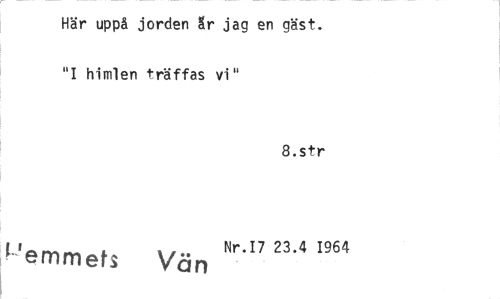 //// Här uppå jorden är jag en gäst. "I himlen träffas vi" //// 8.str //// I emmets Vän Nr.I7 23.4 1964 ////