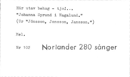 //// Här utav behag - tjo:, //// "Johanna Sprund i Hagalund." //// (Ur "Jönsson, Jonsson, Jansson.") //// 1 Mel. //// Nr 102 Noriander 280 sånger ////