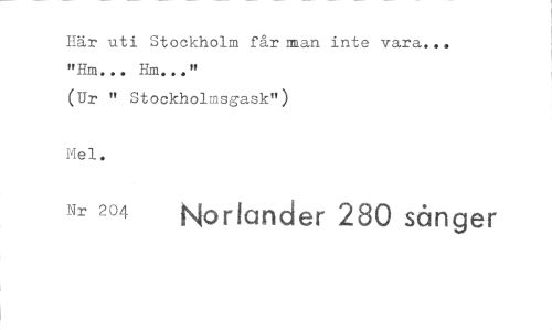 //// Här uti Stockholm får rraan inte vara... "Hm... //// (Ur " Stockholmsgask") //// Mel. //// Nr 204 Norlander 280 sånger ////