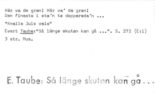 //// Här va de gran: Här va de gran: Den finaste i sta'n te doppareda'n //// "Knalle Juls vals" //// Evert Taube:"Så länge skutan kan gå ...". S. 272 (E:1) 3 str. Mus. //// 0 //// E. Taube: Så länge ss:uton kan ga ////