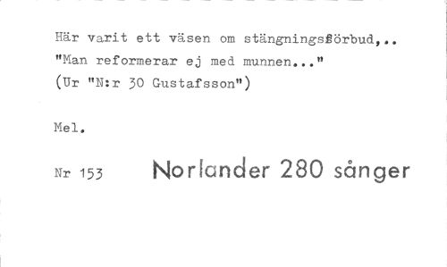 //// Här varit ett väsen om stängningsförbud,.. "Man reformerar ej med munnen..." //// (Ur "N:r 30 Gustafsson") //// Mel. //// Nr 153 Norlander 280 sånger ////