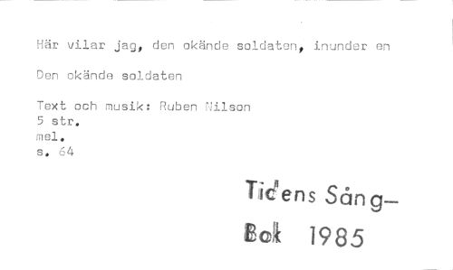 //// Här vilar jag, den okände soldaten, inunder en Den okände soldaten //// Text och musik: Ruben Nilson 5 str. //// mei. //// s. 64 //// Tid ens Sån g--- //// Ecii 1985 ////