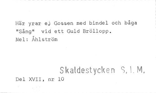 //// Här yrar ej Gossen med bindel och båga "Sång" vid ett Guld Bröllopp. //// Mel: Åhlström //// Skaldestycken S, 1. M, //// Del XVII, nr 10 ////