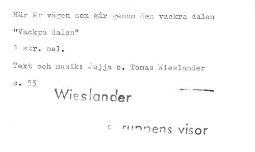 //// Här är vägen som går genom den vackra dalen "Vackra dalen" //// 1 str. mel. //// Text och musik: Jujja o. Tomas Wieslander s. 53 //// Wi sii anoier //// runnens visor ////