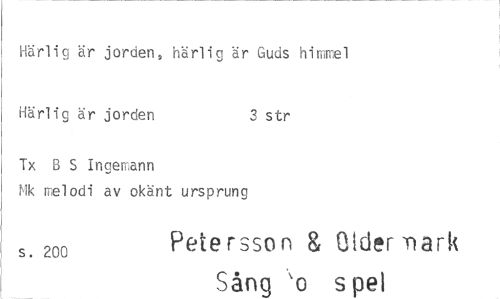 //// Härlig är jorden, härlig är Guds himmel //// Härlig är jorden 3 str //// Tx B S Ingemann //// Nk melodi av okänt ursprung //// s. 200 Petersson & Older snark //// Sång spel ////