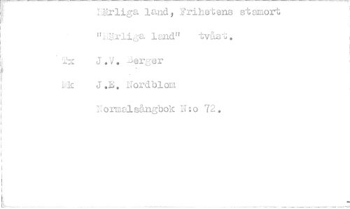//// :ärliga land, Yrihetens stamort "hUrlija land" tvås-c. //// :J2x J,V, jerer //// kk J,I, Nordblom //// 7:ormalsångbok U:o 72. ////