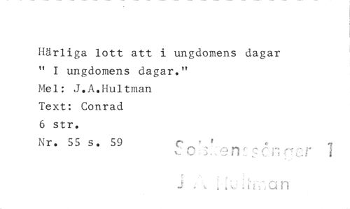//// Härliga lott att i ungdomens dagar " I ungdomens dagar." //// Mel: J.A.Hultman //// Text: Conrad //// 6 str. //// Nr. 55 s. 59 o //// e (Y e Cr; 47 -Cr ////