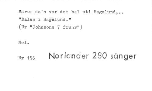 //// Härom da'n var det bal uti Hagalund,.. "Balen i Hagalund." //// (Ur "Johnsons 7 fruar") //// Mel. //// Nr 156 Norlender 280 sånger ////