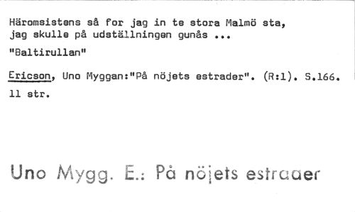 //// Häromsistens så for jag in te stora Malmö sta, jag skulle på udställningen gunås //// "Baltirullan" //// Ericson, Uno Myggan:"På nöjets estrader". (R:1). 3.166. 11 str. //// M gg. E.: På nötets estreuer ////