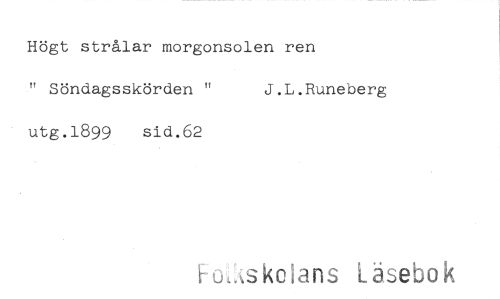 //// Högt strålar morgonsolen ren //// " Söndagsskörden " J.L.Runeberg //// utg.1899 sid.62 //// H.,..,,skoans Läsebok ////