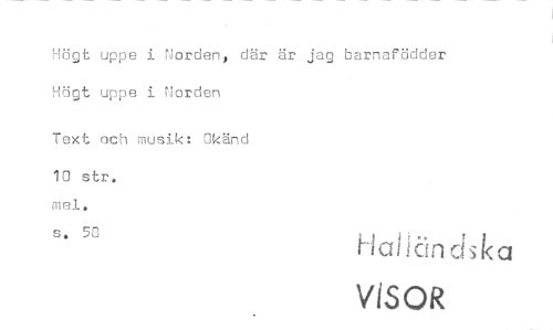 //// Högt uppe i Norden, där är jag barnafödder Högt uppe i Norden //// Text och musik: Okänd 10 str. //// s. 5C Hal ändsko //// VISOR ////