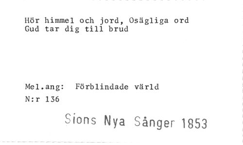 //// Hör himmel och jord, Osägliga ord Gud tar dig till brud //// Mel.ang: Förblindade värld N:r 136 //// Sions Nya Sånger 1853 ////