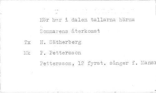 //// Hör r i dalen tallarna härma //// ommarens återkomst //// Tx H. Sätherberg Lik P. Pettersson //// Pettersson, 12 fyrst sånger f. Lians ////