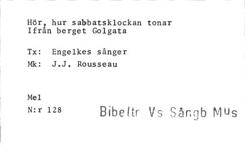 //// Hör, hur sabbatsklockan tonar Ifrån berget Golgata //// Tx: Engelkes sånger Mk: J.J. Rousseau //// Mel //// N:r 128 Bibettr Vs Sångb Mus ////